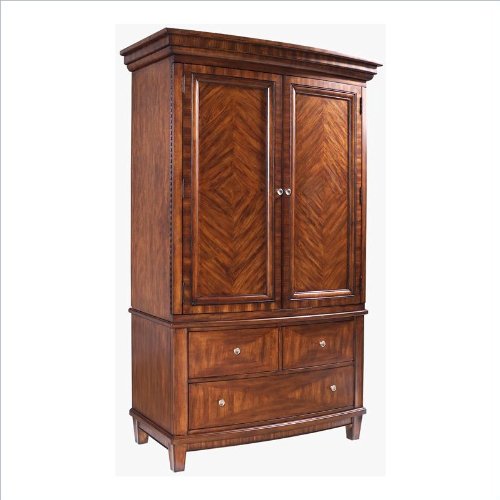 !!!Overview!!! The subtle wood grains and suggestive lines of the Runway TV Armoire Top create a pleasant sensation of static movement that instantly enlivens any room. The top and frame are veneer-wrapped over edges with a membrane press allowing the character of the veneer pattern to continue over the edgework like a waterfall. Veneer lay ups are bold and expressive using rich primavera as the primary veneer. Zebrano is used in addition as an accent border on door frames bringing further attention to the case fronts. The primavera is patterned in diamond patterns on the door panels. Features: TV Armoire crafted from Poplar and Rubberwood solids with Zebrano and Prima Vera Veneers Rich, satiny, medium to dark brown stain Two doors Three lower drawers Hardware has a smooth satin nickel finish that complements the design Profile of hardware is slightly concave in the center Specifications: Overall Dimensions: 78" H x 48" W x 23.5" D Armoire Top Dimensions: 51" H x 48" W x 23.5" D Armoire Base Dimensions: 27" H x 43.5" W x 21.25" D Overall Weight: 321 lbs Armoire Top Weight: 219 lbs Armoire Base Weight: 102 lbs Manufacturer Limited 1-Year Warranty Against Manufacturing Defects
