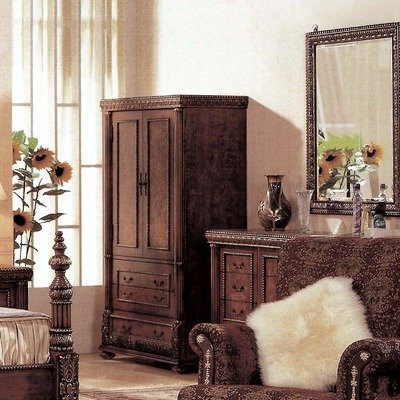 !!!Overview!!! Wayfair - Wildon Home 8424TV Features: -TV armoire. -Bella collection. -Combination of Mahogany and Ash Burl finishes. -Gold accents.-Solid hardwood and veneer construction. -Intricate resin carvings. -Double hinged wrap around doors. -Three dovetail drawers. -Includes clothing rod. -Assembly required. -Manufacturer provides 6 months limited warranty against product defects.