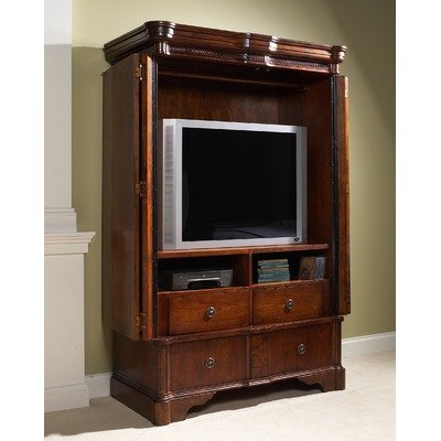 !!!Overview!!! Cresent Furniture 2110 / 2110B Inspired by 19th century English antiques found on the estates of Lincolnchire county, Regent's Park addresses consumers' renewed interest in traditional styling, updated to make it adaptable and fresh. It is crafted of book-matched Appalachian cherry with walnut and mappa burl inlay in a hand-rubbed, antiqued nut-brown finish with burnished brass hardware. It is built to last and crafted with time honored construction techniques that include Mortise and Tenon joinery, framed wood dustproofing, English dovetailed drawers, floating construction that allows for expansion and contraction and fitted wood case backs for additional strength. Features: -Media armoire. -Regent's Park collection. -Wood construction. -Two large full wrap around doors, two adjustable shelves and one fixed shelf. -Two external cedar lined drawers and two internal drawers with full depth for maximum storage. -Removable hanging clothes bar and a slide-out back panel to accommodate a television. -Holes provided for wire management. -Manufacturer provides 12 months warranty.